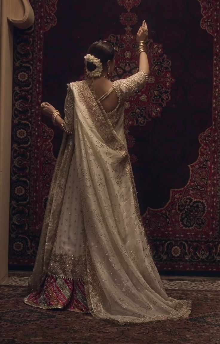 •Prefers silk sarees and lehengas in crimson, ivory, and midnight blue — rich fabrics that whisper as she moves.